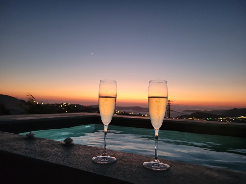 There are a lot of exciting, adventurous things to do in Santorini—catamaran rides, jet ski volcano tours, snorkeling—we did none of it. On our first full day in Santorini we slept until the sun woke us up, then donned our robes and slippers and padded out to our back porch to enjoy the breakfast that had been waiting at our door. We had a private hot tub and pool in our villa, and other than wandering into the village to find treats, that’s where we spent most of our time.