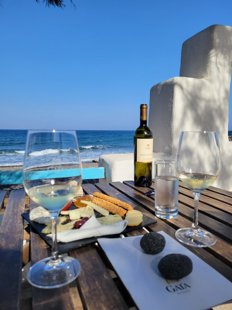 After another slow morning and deliciously curated breakfast, we checked out of our villa and headed to our next hotel, Golden Sunrise Suites. We had a very early flight ahead of us the next morning (the kind you wake up at 3am for), and decided staying near the airport would be worth it (it was). Our hotel was great and Cristina, the host, was so sweet. It was everything we needed for one night. We walked 30 minutes to Kamari Beach where we lounged in the sand for a bit then did some shopping and bakery visiting. After walking back to the hotel and freshening up, we headed to Gaia Winery, which turned out to be a highlight of the trip (as the half dozen bottles of wine in my cellar with their name on it can attest to). A wine and cheese tasting overlooking the Mediterranean Sea? It was one of those pinch-me moments. The wines themselves were fantastic and the sommeliers were so knowledgeable in explaining how the unique volcanic soil on Santorini affects the wine.